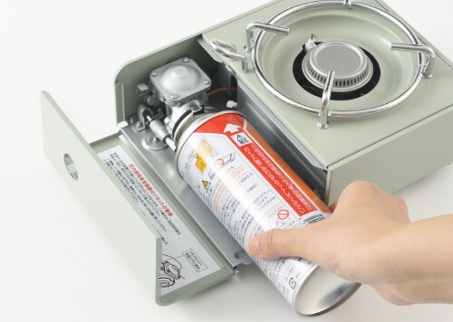 容器(ボンベ)*の着脱は、取りつけ楽々でガス漏れの心配のないマグネット式。安心の圧力感知安全装置付き。