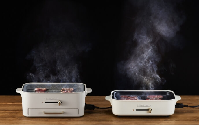 - 煙90%超カットを実現。室内に残るニオイも軽減されるため、おうち焼肉が気軽に愉しめます。