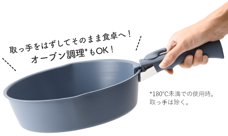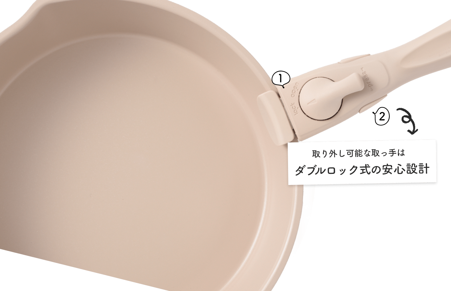 取り外し可能な取っ手はダブルロックなので調理中の思いがけない動作によるロック解除を防ぎます。またフライパンと接する部分はシリコン素材を採用。フライパン本体をしっかり支え、ぐらつきのストレスがないのもうれしいポイントです。