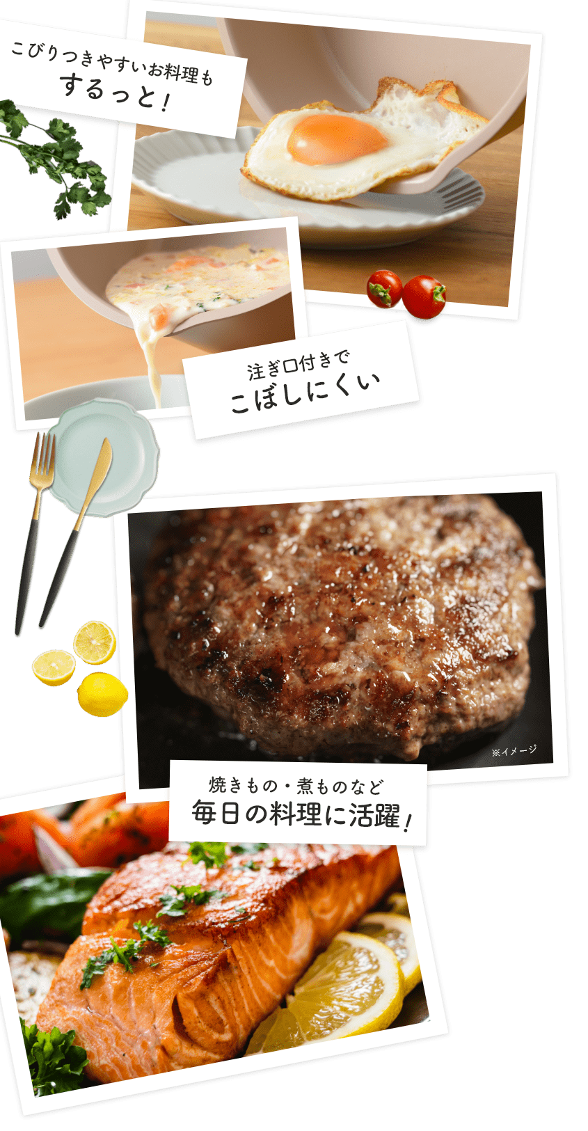 表面加工は食材がくっつきにくく汚れも落ちやすいセラミックノンスティックコーティングだから、焼きもの、煮ものをはじめ、毎日のあらゆるお料理に使えます。