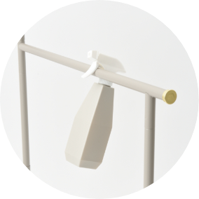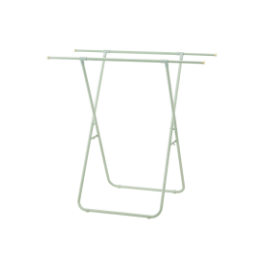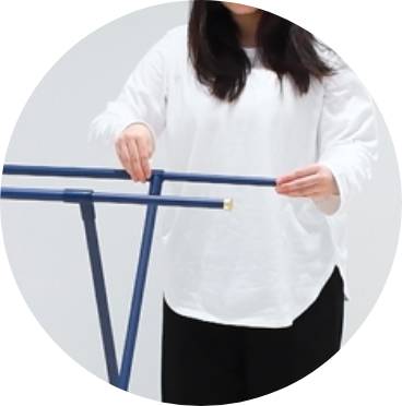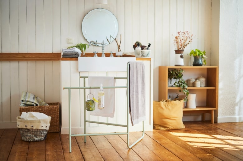 高さ違いのバーで大小さまざまなタオルを干せるタオルスタンド。洗濯ばさみやネット、ファブリックスプレーなど、ランドリーアイテムのちょいかけにもおすすめです。パッと広げてスリムに折りたためるので、使うときと使わないときの切替え動作がスムーズです。