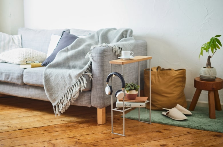 リビングやベッド横ではミニサイドテーブルとしても。天板にはお気に入りの小物を飾ってインテリアを愉しんだり、下のバーは散らかりがちなスリッパの収納したり。アイディア次第で幅広く使えます。