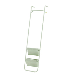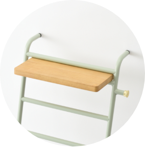 幅47cmのスリムなラダーラックは、ベッド横でリラックスアイテムやブランケットを置くなどせまい空間を有効活用できます。取り外し可能なファブリックラックと帽子や洋服ブラシなどをかけるアームが便利さを格上げ。壁立て掛け式だからちょっとした移動もお手軽です。