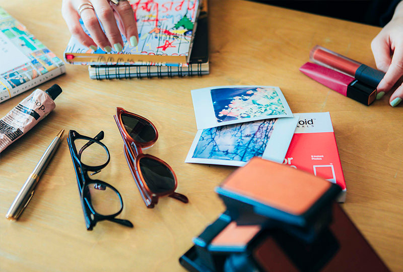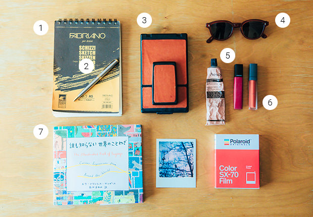1_アイデアやレシピを書き留めるためのノート。2_〈Parker〉のボールペンは大切な友人からの贈り物。3_お気に入りの〈ポラロイド社〉のインスタントカメラはレザー仕様。フィルムに像が浮かび上がるまでの待ち時間も愛おしい。4_〈ayame〉のサングラス。すっぴんで出かけることも多いのでスタメンアイテム。5_ハンドクリームは〈Aesop〉を何年もリピートしている。6_カジュアルな服装が多いので、リップはレッドかオレンジで華やかな気分に。7_本はインスピレーションの源!「言葉」を大事にしたい。