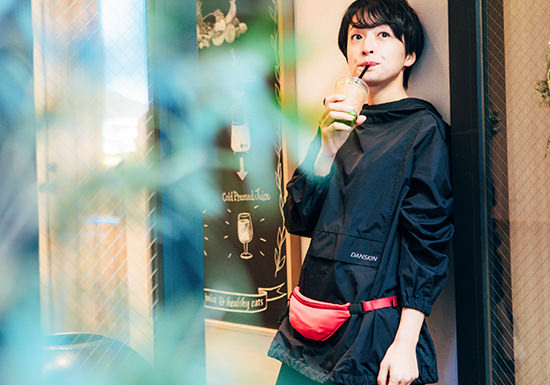高山さんの日課となっているランニング。走っているときも気にならないくらいコンパクトなベルトポーチをチョイス。ランニング後はジューススタンドに立ち寄ってビタミンチャージ!「バッグをまるごと洗えるのも助かりますね!」
