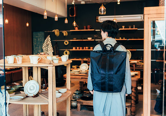 「お料理は目でも楽しみたいから、美しい器が大好きなんです」。バックパックを背負い、空いた両手でお目当ての器に触れて真剣に物色中……。X-Pacの生地はタフでいて大人感があるから、品のいいお店にも馴染む。