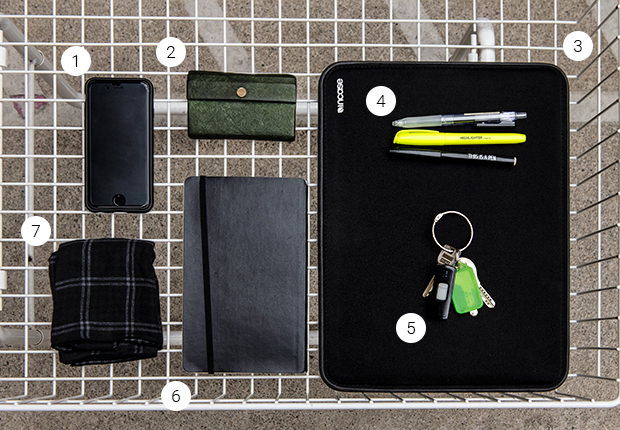 1_スケジュール管理やインタビューの録音など、iPhoneは仕事に欠かせない。2_友人が手がけるブランド〈POSTALCO〉の名刺ケース。使い勝手がよく、時間が経つごとに味が出てくる和紙素材なのもお気に入り。3_PCはどこでも仕事ができるように常に持ち歩く。4_メモをとるためのペンを1、2本。〈無印良品〉のペンがとくに好き。5_こだわりはないが、ハンカチはダークカラーが好み。6_〈Moleskine〉のノートには、アイデアや打ち合わせのメモ書きがびっしり。7_キーリングにUSBメモリをつけてキーホルダーがわりに。