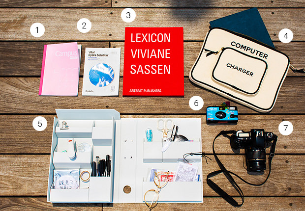 1_スケジュール管理はノート派。脳内整理にもなる(笑) 2_お気に入りの韓国製の保湿マスクは、旅先にいつも持ち歩く必需品。3_色やコンポジジョンが大好きなヴィヴィアン・サッセンのサイン入り写真集。4_タブレットはマイクロソフトのSurfaceを愛用。容量が大きくてイラスト制作にも大活躍! 5_ホームオフィスがそのまま外出先に持ち出せる、便利なツールファイル。6_〈Lomography〉の使い捨てフィルムカメラ。カラーフラッシュでアート写真が簡単に撮れるのがいい。7_〈Canon〉のフィルムカメラは、ちょうどいい大きさとピントが合わせやすいのがポイント。