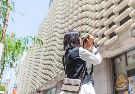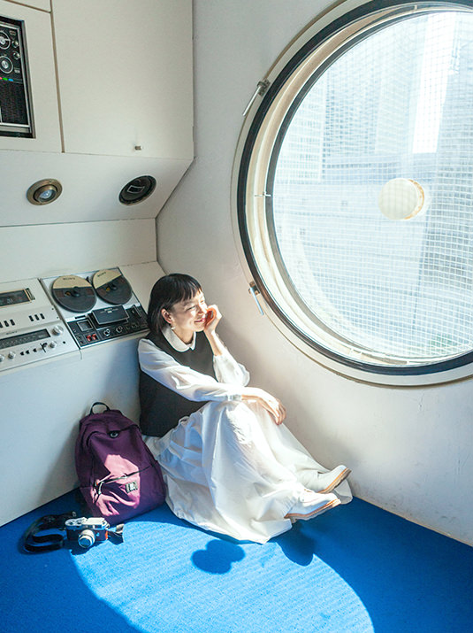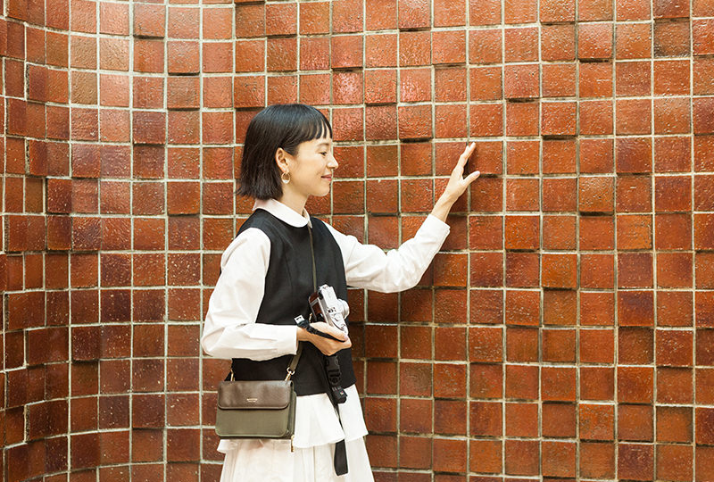 最初に向かったのは、積み木のような外観が目を引く黒川紀章設計の集合住宅、中銀カプセルタワービル。「室内は船室のようなデザインで面白いですね。丸窓も象徴的!」。どんなシーンにも使い勝手のいいバックパックは、秋を感じさせるボルドー色をチョイスして。