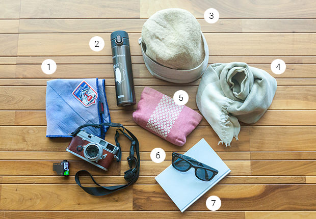 1_〈LEICA〉MPは10年以上使い続けている愛機。ラップケースは味気がないので、ワッペンでデコレーションして。2_水筒はシーズンを問わずに持ち歩く。コーヒーショップではタンブラーがわりにもなるので便利。3_形を気にせずたたんでバッグに収納できる帽子。4_ストールは〈アトリエシムラ〉のものを愛用。肌触りが◎ 5_青森の「こぎん刺し」が可愛いポーチには、リップ、目薬などの小物を入れて。6_サングラスは一年を通して使う。いろいろ持っているけど、今日は半分にたたんで収納できるこちらを。7_バッグには必ず本を一冊。小説やエッセイなど幅広いジャンルを楽しむ。