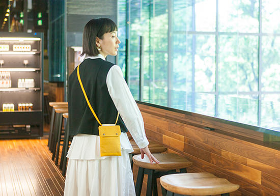 丹下健三が設計した草月会館の中にある、一面ガラス張りの美しいカフェでまったりと過ごす昼下がり。「コーヒー片手に、緑が広がる景色を眺めるなんて贅沢ですよね。ここが東京とは思えない!」。バッグには必要最低限の荷物だけを入れて、心まで開放された気分。