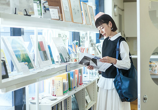 「建築とデザインを専門とするギャラリーって、日本では珍しいんですよ」と、訪れたのはTOTOギャラリー・間。たっぷりと光が入る美しい空間で、ゆっくりと展示を眺めるKIKI さん。ワンショルダーも斜めがけもOKなシンプルかつ上品なショルダーバッグがよく似合う。