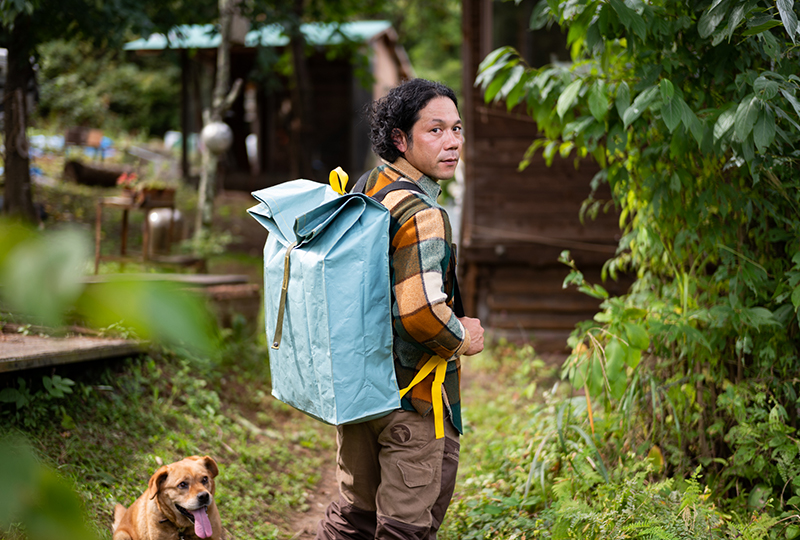 自分の畑で採れたものだけじゃ足りないときは、店へ買い出しに。「このグリーンファームは地元密着型でお気に入りです」と、バックパックに野菜やキノコを次々に。チャーちゃんは、トランクにシートバッグを取り付けた特等席で満足顔。汚れを気にせず使えるから大竹さんも満足顔。