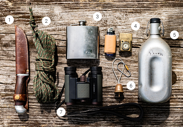 1_愛用しているのはスウェーデン製のビンテージナイフ。スウェーデン製は鋼の質が良く長く使えるのがお気に入りの理由。2_万が一に備えて、常に20mロープを持ち歩いている。3_お酒を入れたスキットル。かつてはバー経営が夢だったくらい、お酒が大好き。4_ライターに巻いてあるのはガムテープ。火を熾す時に使用する。通常のライターが湿気てしまったときのために、オイルライターも兼用。5_使い込まれた〈LAKEN〉の水筒は、10代の頃からの愛用品。6_熊よけの鈴。優しい音がするものが好み。7_双眼鏡はコンパクトなものを。ハンティングの時に獲物を探すのはもちろん、自然観察でも重宝する。