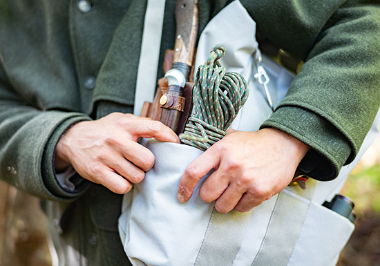 冬の間はレストランを締めて、ハンティングに精を出す。「チャーちゃんは、物陰の獲物を見つけてくれたりするから、こう見えて優秀な相棒なんですよ」。この日もチャーちゃんは鼻息荒く、ヤル気十分。ナイフやロープなどすぐに取り出したいものは外ポケットに収納。