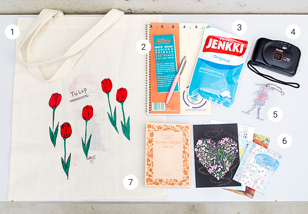 1_友人が作ってくれたというエコバッグは必需品。万が一出先で荷物が増えてもこれがあれば安心。2_思いついたことなどは、すぐにノートに書き込む派。3_フィンランドのガムは癖のない爽やかな味がお気に入り。4_写真好きの父親から譲り受けたというトイカメラ。人物のスナップを撮ることが多いそう。5_スウェーデンの童話に出てくる女の子「長くつ下のピッピ」のリフレクターキーホルダー。6_フィンランドに住む親戚や友人などに手紙を出すことも多いので、ポストカードはノートに挟んで常に持ち歩いている。7_普段、空いた時間は読書にあてている。今回持っていたのは、『君たちはどう生きるか』の文庫本。