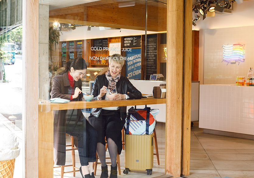 到着したシルックさんをお出迎え。シルックさんは、機内持ち込みサイズのハードキャリーと小さく収納できるトートという旅慣れた軽快なスタイル。「KIPPY’S COCO-CREAM」で食べたアイスは「スッと体に染みこむ感じが新鮮」とシルックさんにも大好評。