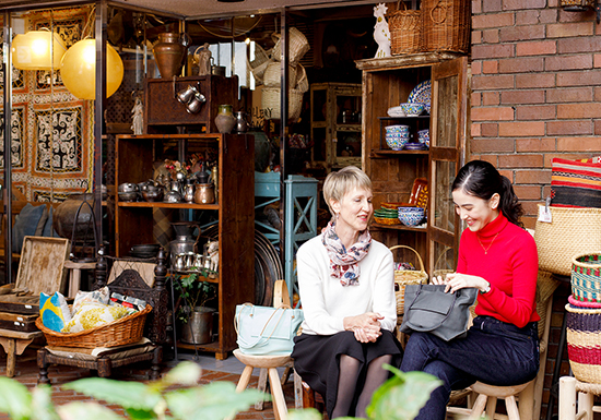 次に立ち寄ったのは雑貨屋さん。「あれも良い、これも可愛い」と言い合う姿はまるで仲の良い友人のよう。マチが大きいトートなら買った物の収納も問題なし。「貴重品やカメラなどを入れてもまだ余裕があるし、中の物も取り出しやすい」と志暁さんも使い心地に満足。