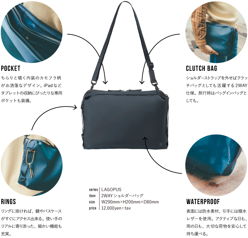 吸い込まれるようなマットな質感を纏ったショルダーバッグ。防水と思えないほど、仕上がりは軽く丁度いいサイズ感も魅力。アクティブな週末、雨の通勤、そしてトホホなゲリラ豪雨も、これさえあれば大丈夫!